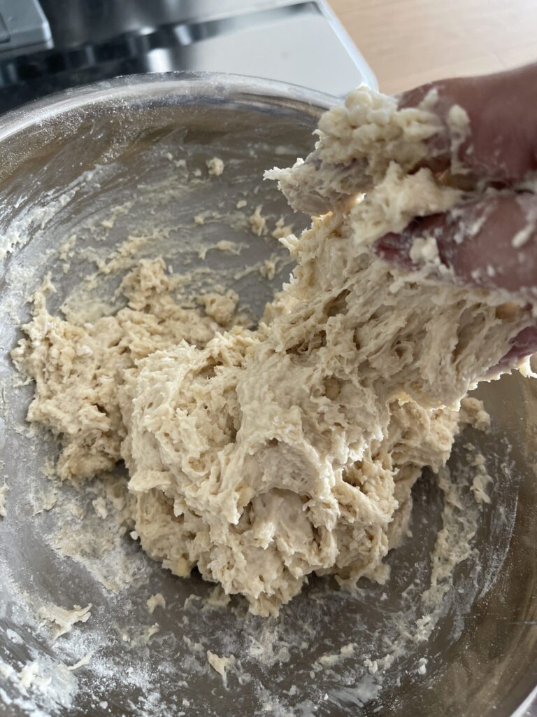Tip the dough onto a lightly floured surface and knead for about 8–10 minutes. It will start out sticky, but the more you knead, the smoother and softer it becomes. You’re aiming for a dough that is elastic and slightly tacky, but not sticking all over your hands.